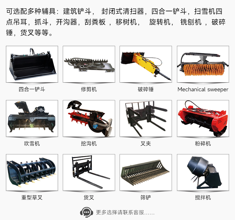5,可選配多種輔具:建筑鏟斗, 封閉式清掃器,四合一鏟斗,掃雪機(jī)四點(diǎn)吊耳,抓斗,開溝器